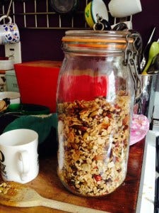 Remove from the oven and add the fruit. Stir it all up and when completely cool put in jar with a good seal. Then eat it with plain yoghurt, or by the handful, with milk or almond milk, chopped banana and big cup of coffee. Feel better about the world.