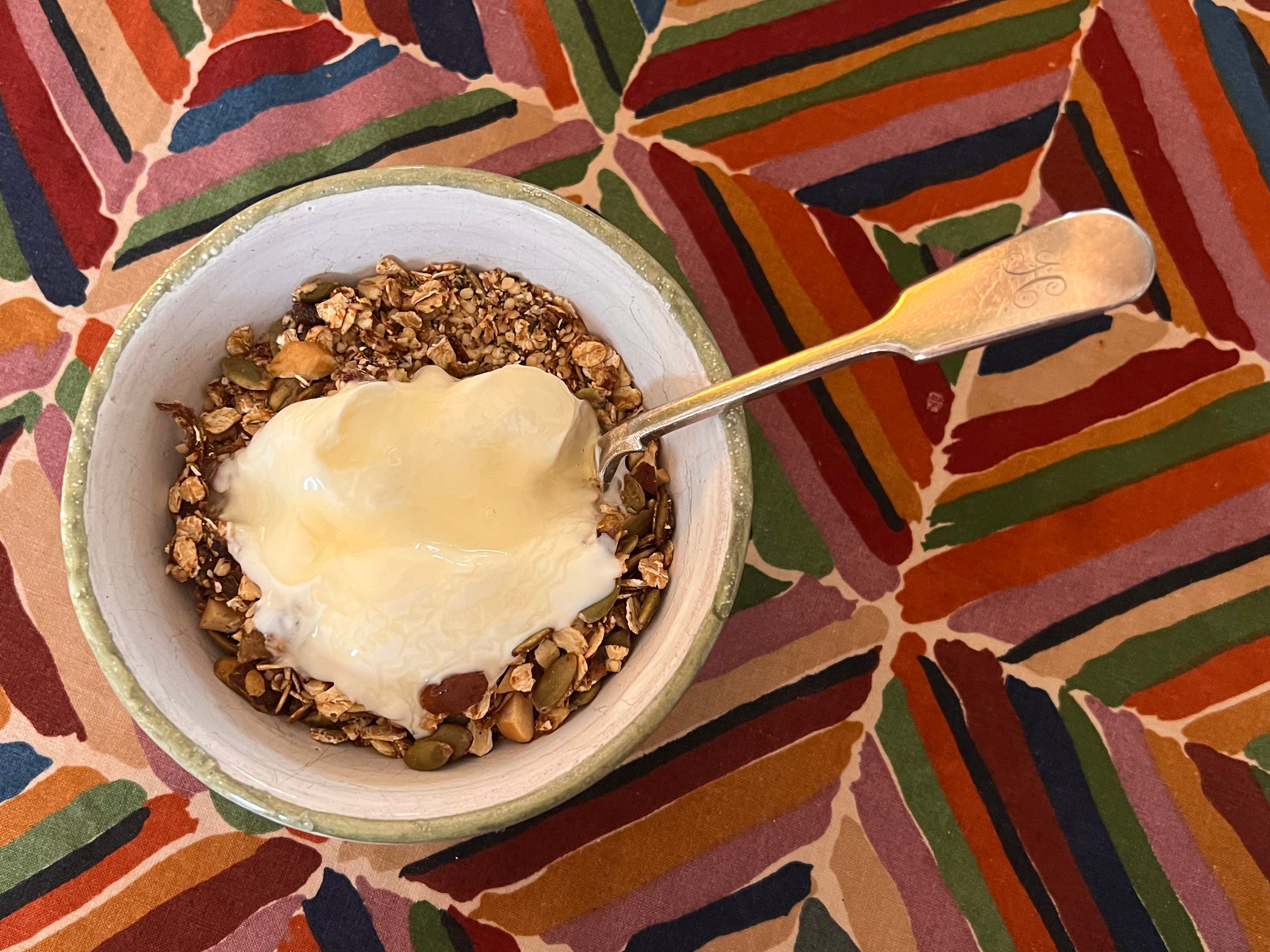 Breakfast, or lunch, or supper. I do yoga on Wednesday evenings and so don’t sit down to eat dinner - can’t do downward dogs on a stomach full of macaroni cheese. I get home about 9pm and don’t want to eat much then either so a bowl of lovely toasty nutty flavoured granola with yoghurt does the job beautifully.