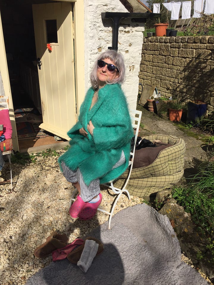 Me aged whatever… trying out long hair again (not good idea) and playing with pink rinse, also not good. But excellent mohair coat and borrowed crocs ensemble, don’t you think?