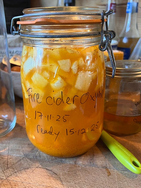 What’s ailing you then? Whatever it is I reckon this will fix it. It’s not quite ready but I have sampled some, as has my teetering-on-the-brink-of-ailing husband. I made this after reading a fellow sub stacker Sue Kusch’s post on winter remedies. Sue very generously offered her recipes for free and I have taken up her offer and made some of the Fire Cider Oxymel, not to be confused with oxytocin or oxycontin which would have very different results I suspect, adapted a bit due to lack of some of the ingredients and US/UK measuring. I will put my recipe at the end but full credit to Sue, and the link above will take you the original recipe, plus others which I don’t have the self discipline to make.